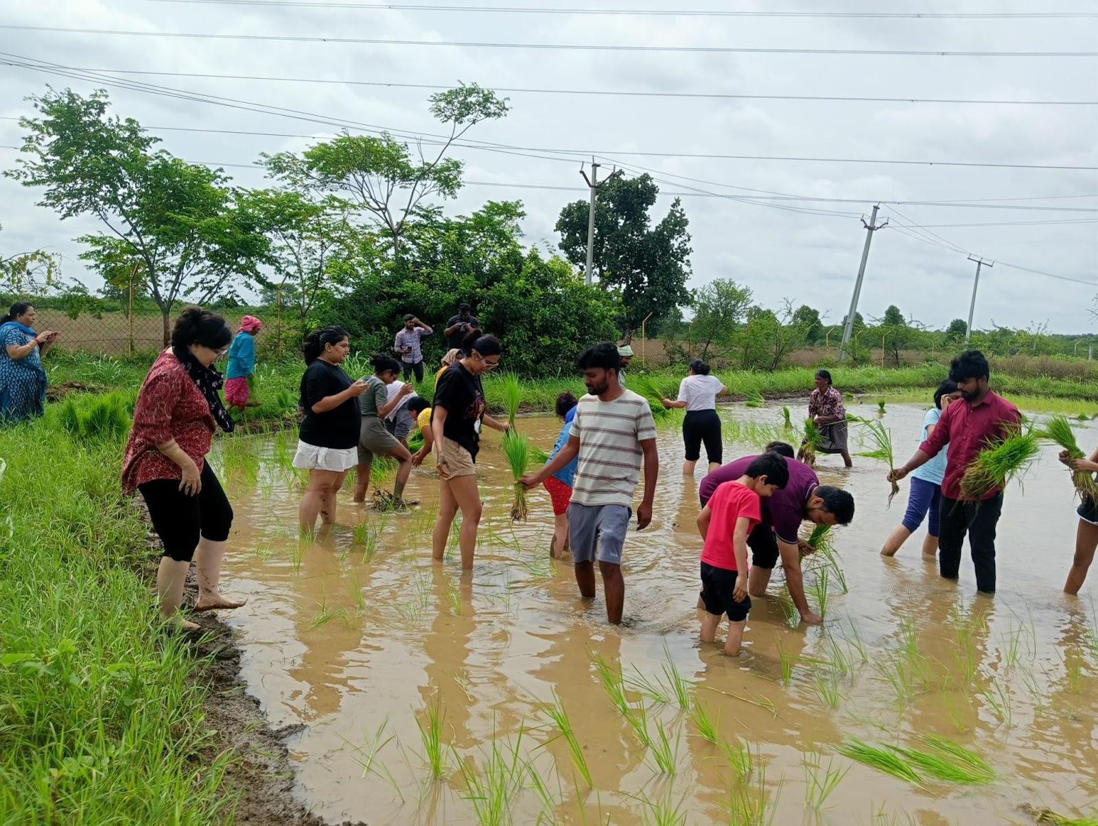 Clutching paddy bunches, they planted saplings together, embodying teamwork, joy, and a shared sense of discovery.