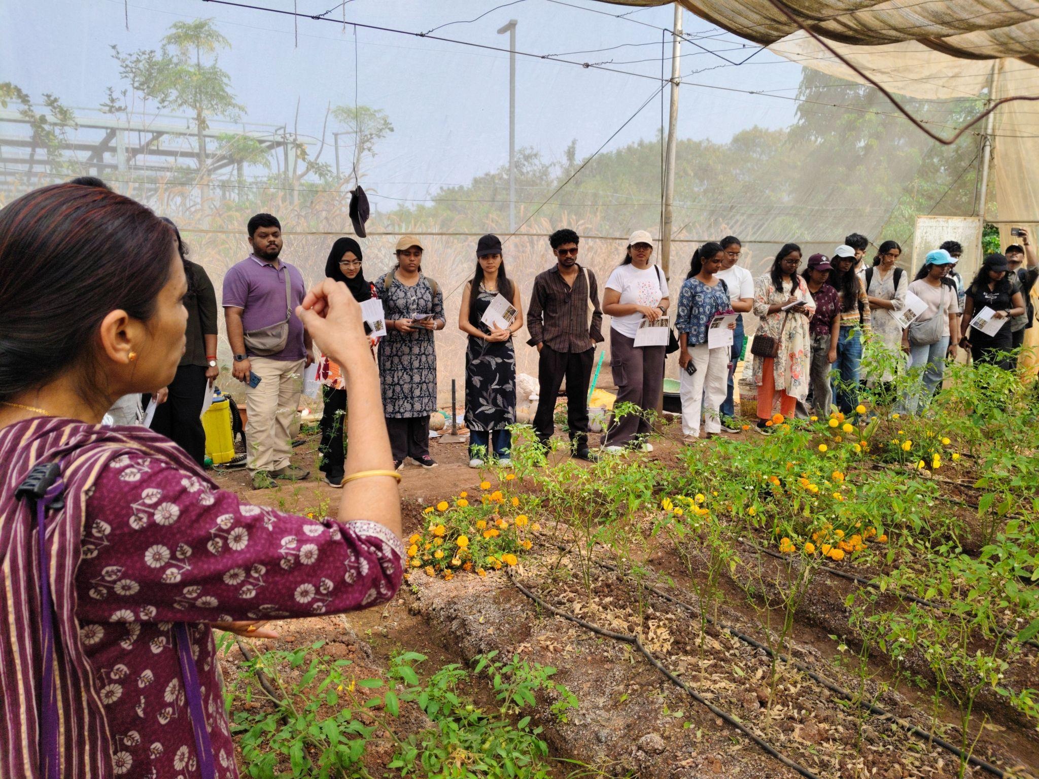 As part of their exploration of the Food strand, students visited the netted house and agricultural zones within the community. Here, they were introduced to natural farming methods, efficient drip irrigation techniques, and crop planning systems that support a self-reliant lifestyle for residents.