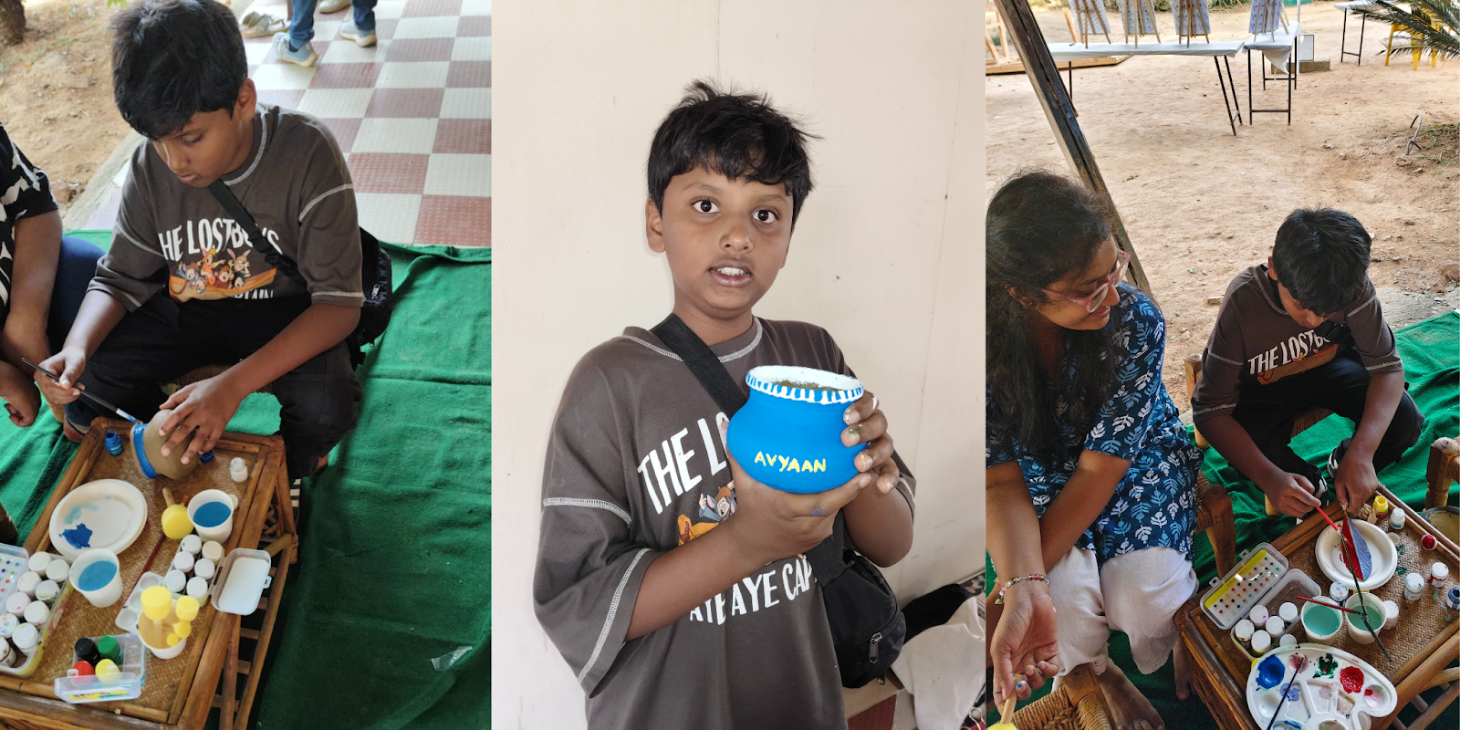 Children gathered around the pottery painting tables, carefully choosing colours and bringing plain clay pots to life. This activity not only nurtured artistic skills but also introduced children to traditional art forms in an accessible and joyful way.