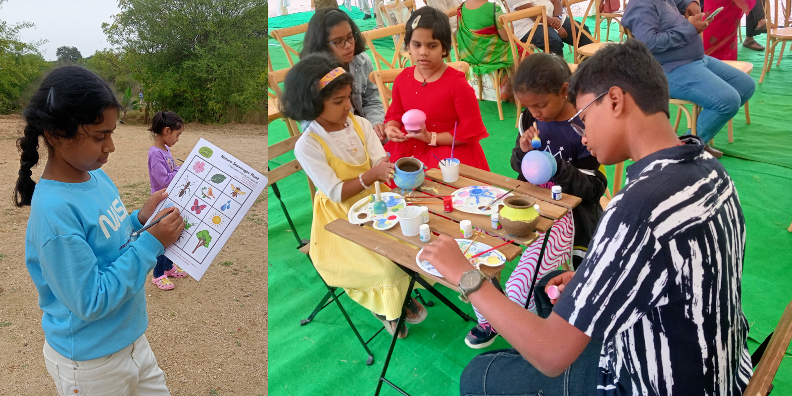 The first day unfolded with a gentle focus on clay pot painting and botanical illustration—activities that helped children connect creativity with the natural world.