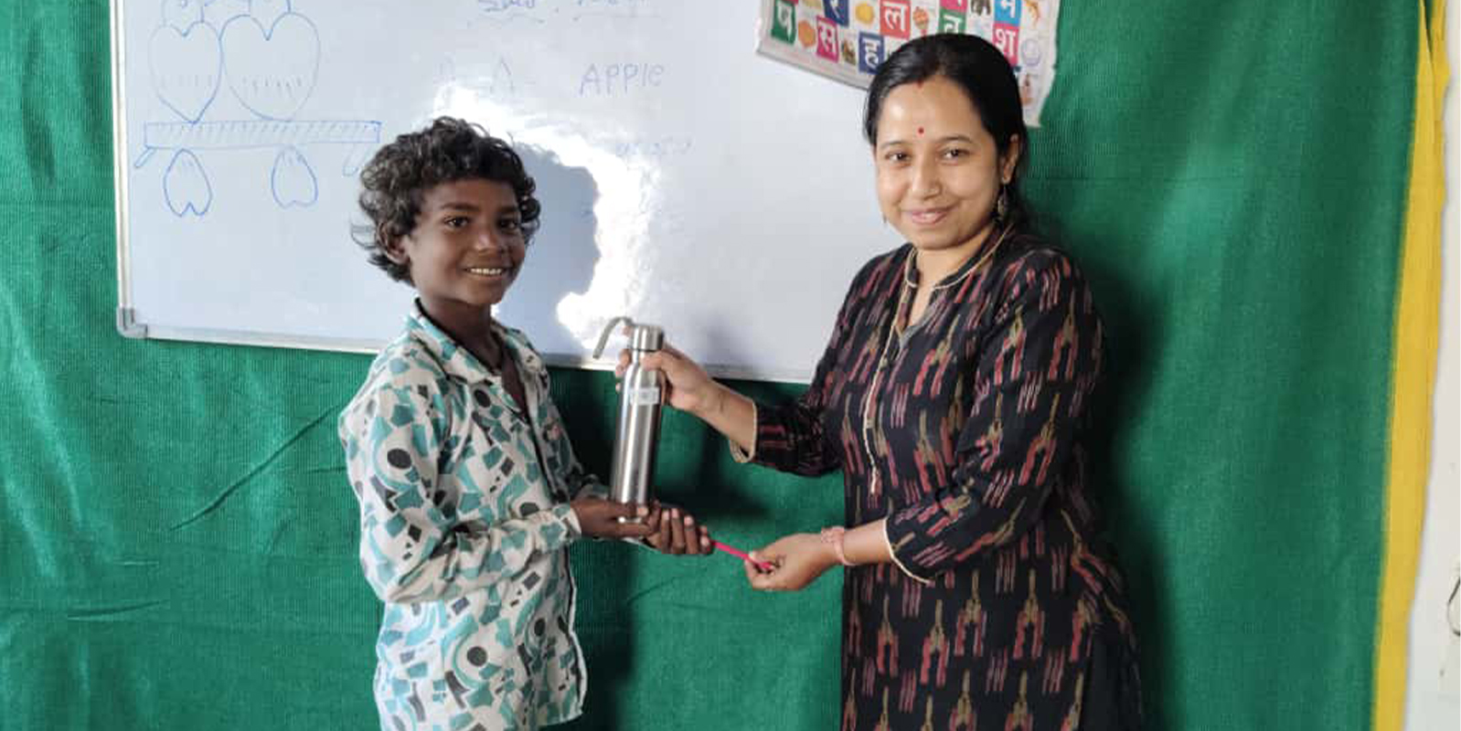The team presented each child with a small token of appreciation in the form of stainless steel water bottles and pencil kits. The students received their gifts with excitement, and the happiness on their faces lit up the entire classroom.